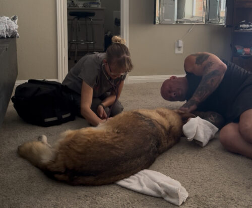 I hope someday my life will end so beautifully! Buffy was beyond amazing, even for a Belgian Malinois. We had had her for 15 1/2 years, from the age of 5 weeks; she was our war hero and medical service dog. After years of physical therapy and medications for degenerative spinal stenosis, the disease and pain finally incapacitated her. Buffy fought the good fight, never complaining, always wanting to work. She was more than a daughter to us, and I dreaded what might happen at the end. We had spoken at length to Dr. Killian, who spent a great deal of time answering all our questions. Due to Covid, we could not have a house full of guests, but two witnesses were allowed. Dr. Killian (who I called the “Vet Vet”) showed great respect for our home and our baby. He did not rush us, but looked at the pictures and articles I showed him, so that he could better know his patient. After a gentle examination, he decided to change the choice of medications a bit. He stood aside respectfully while we spoke to Buffy. Then he introduced himself to her, and knelt behind her so that we could be in front of her. Even her younger brother, our Mal-ffunction was there, sitting between us. Dr. Killian stroked her and spoke gently to her, telling her at each stage what he was going to do. I held my baby’s head and sang to her and spoke to her. As promised, he first took away her pain – she was still alert and responding, and we were allowed some final time with her. Then he – very, very slowly, ended her life. She did not whine or jerk – she simply went to sleep, and then died in her sleep. Dr. Killian waited for us to put her on a bier and place a flag over her, then helped my husband and the other veterans carry her out. I don’t remember everything he said, but I remember that he showed respect and strong sympathetic emotion throughout our ordeal. All our wishes were followed, and – most importantly – he showed consideration and respect for Our Girl. I hope that someday they change the laws so that Dr. Killian can send me off in such a peaceful way.